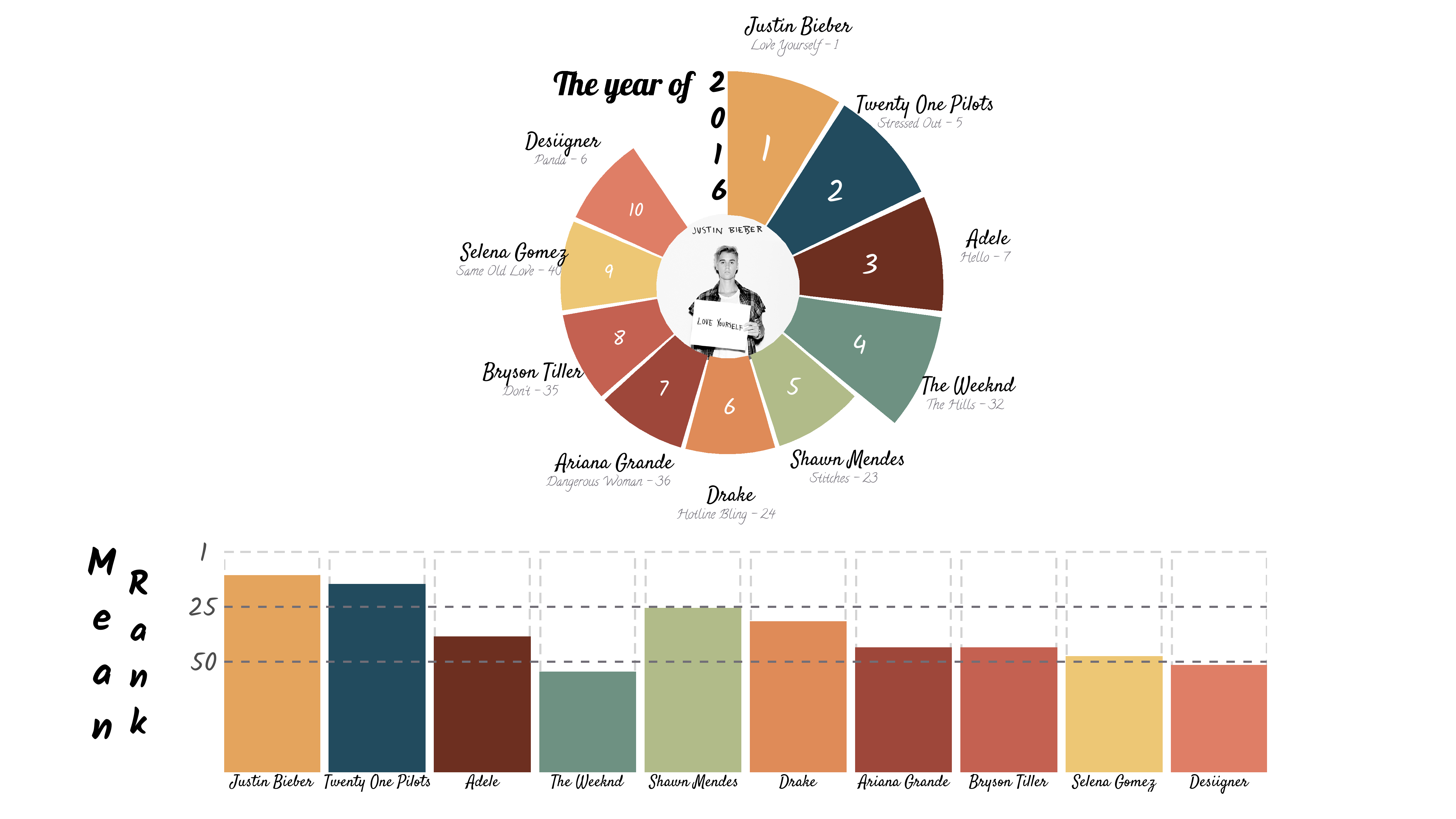 经过大致的数据浏览,我决定选取2016年的数据,以歌曲上榜数量以及歌曲平均排行为指标,决出当年的十大歌手。