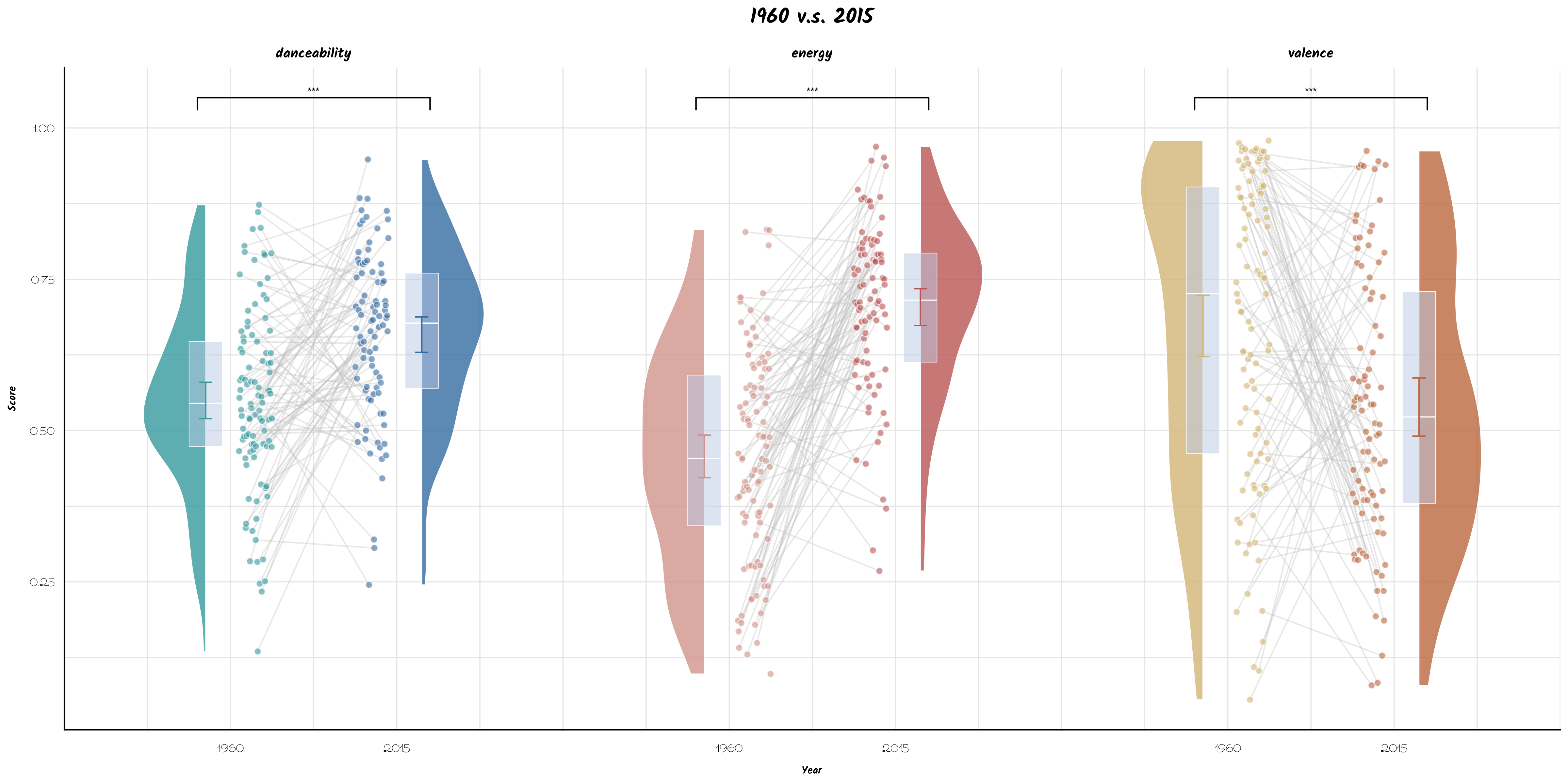 结果反应1960与2015间Top100歌曲在效价、能量值与舞动性均存在统计学意义上的显著性差异,总体变化趋势与第三部分的结果一致。